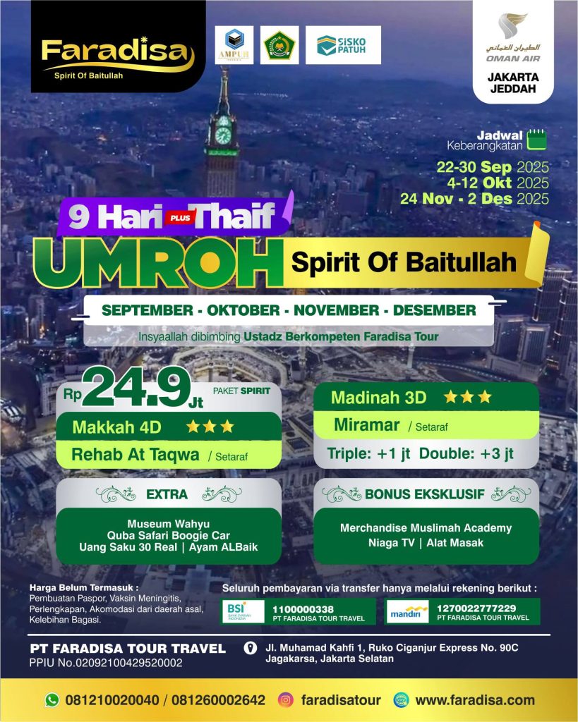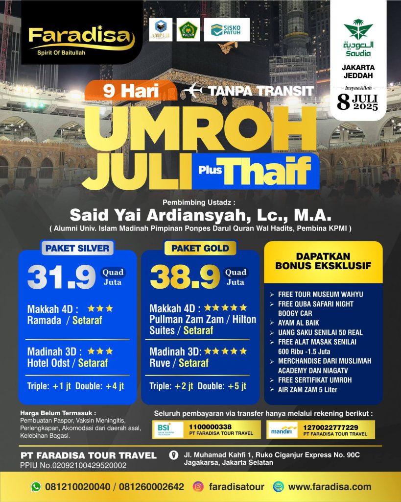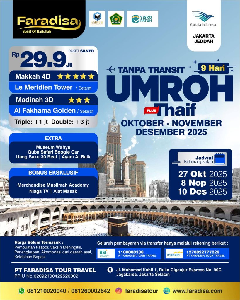 PT Faradisa Tour & Travel hadir sebagai sahabat perjalanan ibadah Anda menuju Tanah Suci dengan layanan yang mengedepankan ketenangan, keberkahan, dan amanah dalam setiap langkah.